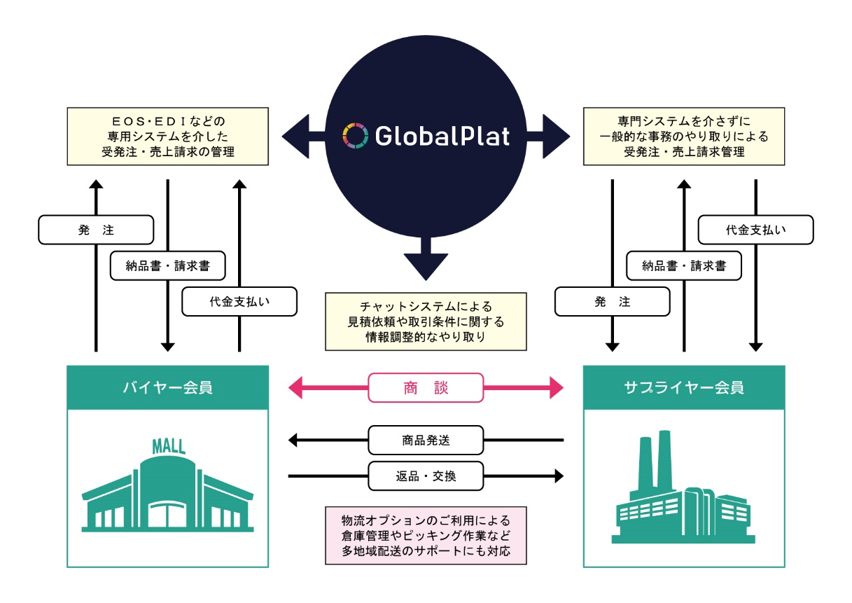 GlobalPlatとはバイヤー(量販店各社、小売チェーンストア、商店組合など大中規模に限る)とサプライヤー(メーカー、輸入販売会社など国内流通の川上企業に限る)をマッチングさせるBtoB専門マーケットプレイス(会員登録無料・審査あり)のサイトです。
